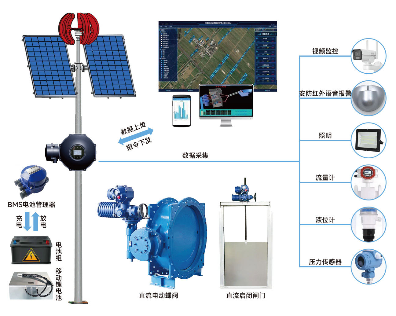 由太陽能光伏板和小型風力發電機為蓄能電池組充電,電池組有BMS電池管理軟件管控,為永磁無刷直流電機的各類驅動裝置供電,同時為視頻監控,壓力、流量、液位傳感器,照明等供電